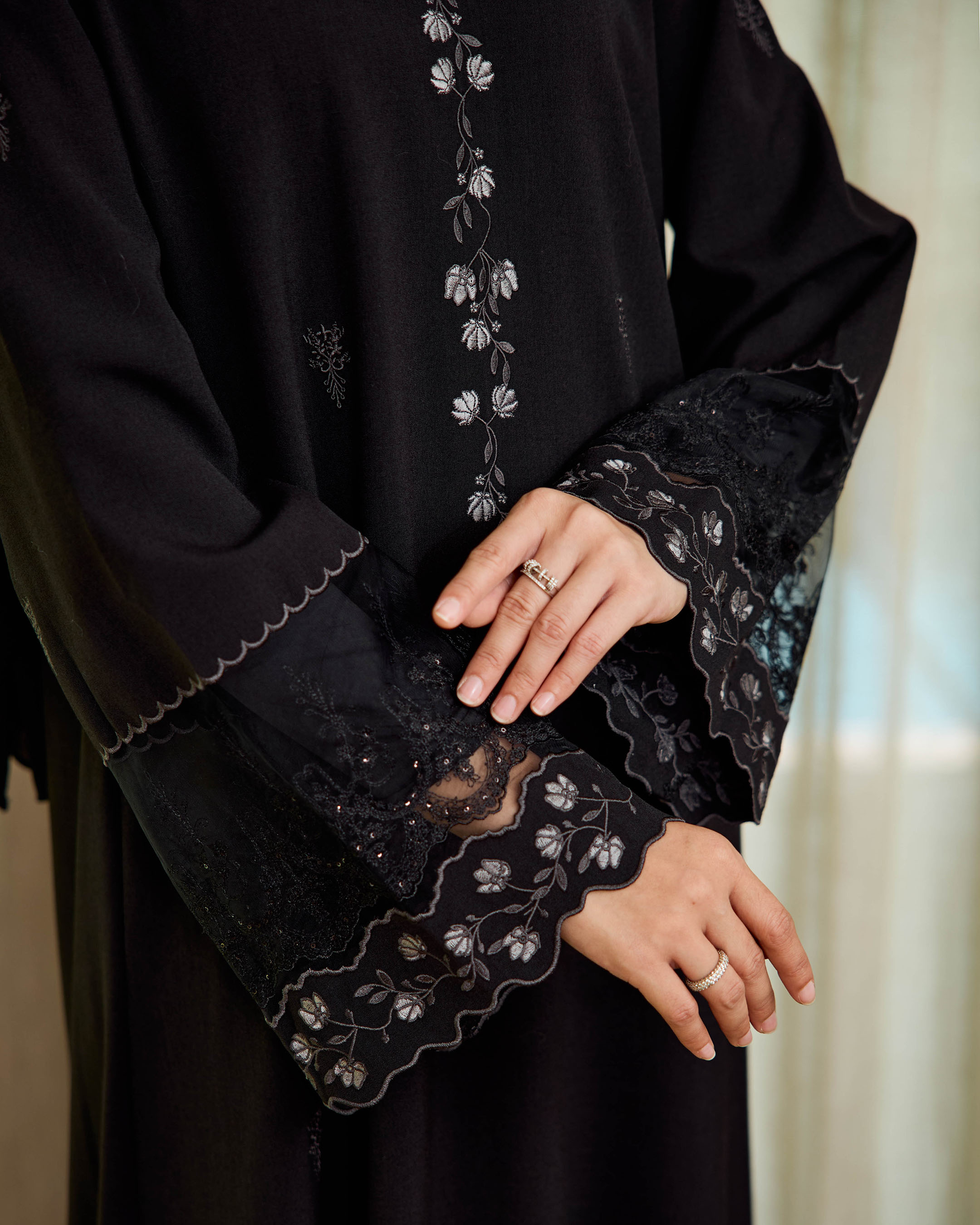 Crafted with delicate floral embroidery and lace sleeves, this jubah exudes femininity and grace. It comes complete with a free inner and matching shawl, making it a ready-to-wear ensemble for festive occasions or special gatherings. Flowing lines and intricate details ensure you step out with confidence and charm.